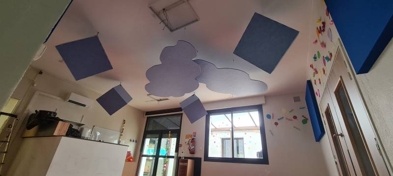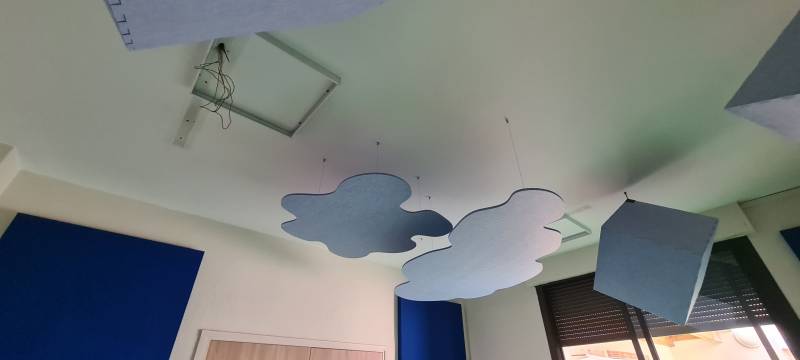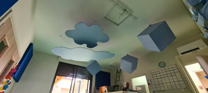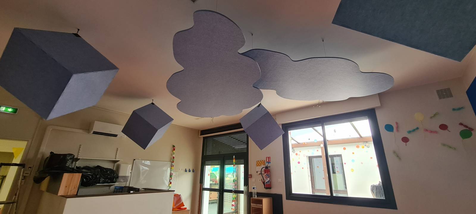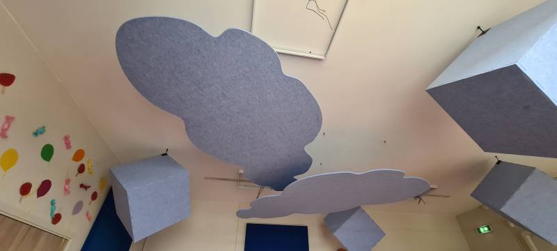 Pour ACB, le choix s’est donc naturellement porté sur des éléments acoustiques suspendus : formes nuages et cubes acoustiques en PET recyclé et recyclable, dénués de tout composant chimique qui peuvent porter atteinte à la santé des enfants.