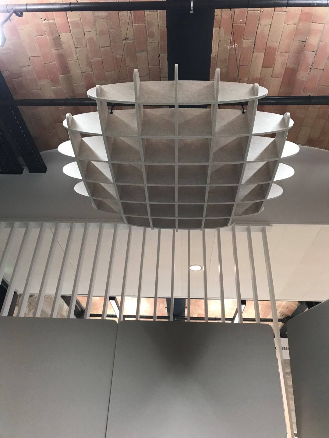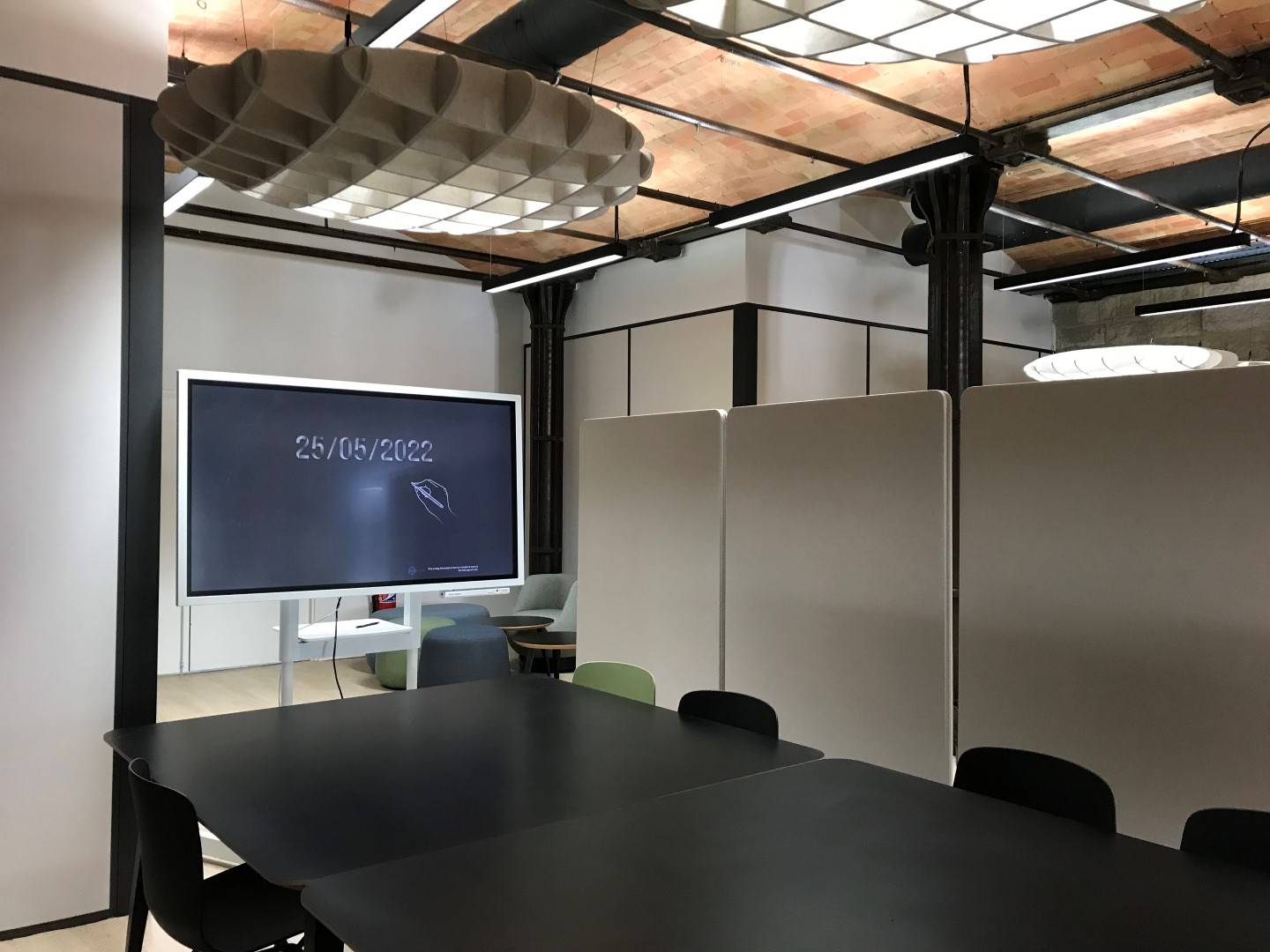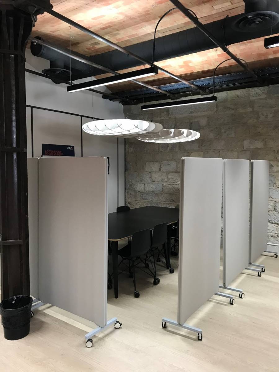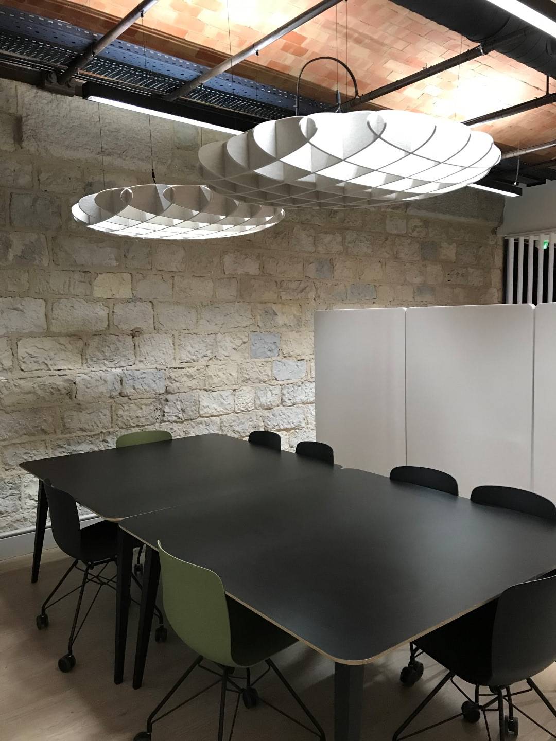 Le choix a donc été fait de cloisonner les différents espace de travail à l'aide de cloisons acoustiques mobiles de marque LINTEX. Pour renforcer le confort et ajouter une touche esthétique, des suspensions en PET recyclé de type LIEGO de marque ARTECK ont été suspendues au plafond. Ce type de suspension ajourée permet également de conserver la luminosité sur les plans de travail.